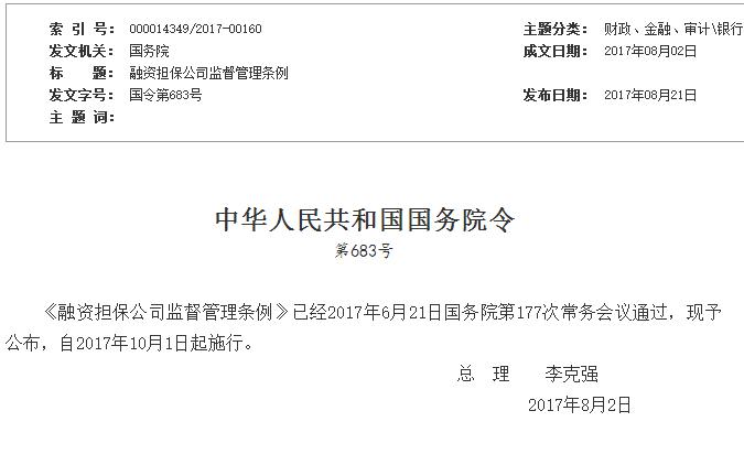 為了規(guī)范融資擔(dān)保公司的行為,防范風(fēng)險,2017年8月2日,國務(wù)院總理李克強(qiáng)簽署國務(wù)院令683號,公布《融資擔(dān)保公司監(jiān)督管理?xiàng)l例》(以下簡稱條例),自2017年10月1日起施行。