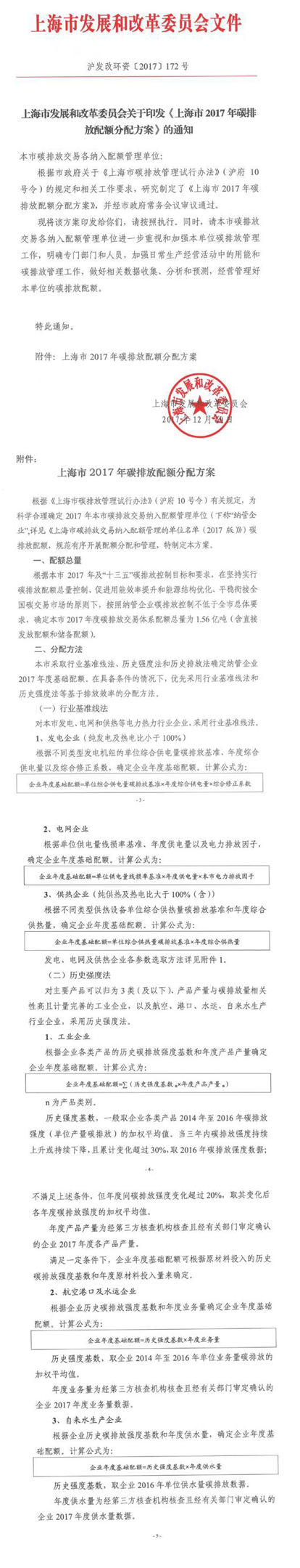 上海發改委印發2017碳排放配額分配方案 配額總量為1.56億噸