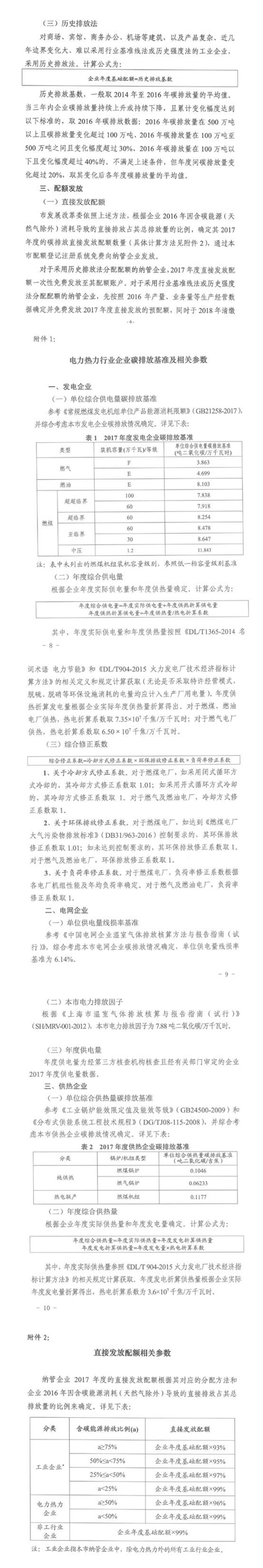 近日,上海市發改 委印發了《上海市2017年碳排放配額分配方案》, 方案中確定了上海市2017度碳排放交易體系配額總量為1.56億噸(含直接發放配額和儲備配額)。上海市采取行業基準線法、歷史強度法和歷史排放法確定納管企業2017年度基礎配額。在具備條件的情況下,優先采用行業基準線法和歷史強度法等基于排放效率的分配方法。發電企業:根據不同類型發電機組的單位綜合供電量碳排放基準、年度綜合供電量以及綜合修正系數,確定企業年度基礎配額。電網企業:根據單位供電量線損率基準、年度供電量以及電子排放因子,確定企業年度基礎配額。