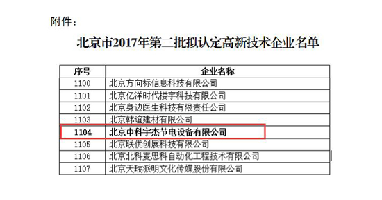 近日,國(guó)家高新技術(shù)企業(yè)認(rèn)定管理工作網(wǎng)發(fā)布了《關(guān)于公示豐臺(tái)園2017年第二批擬認(rèn)定高新技術(shù)企業(yè)名單的通知》,北京中科宇杰節(jié)電設(shè)備有限公司通過(guò)認(rèn)證,榮獲“國(guó)家高新技術(shù)企業(yè)”的殊榮。