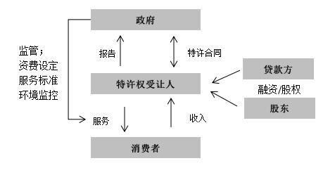 特許經(jīng)營權(quán)允許社會資本運營商(受讓人)在指定區(qū)域內(nèi)負資全商提供公共服務(wù),包括系統(tǒng)的運營、維護,征收費用,管理,建設(shè)和修復等,同時,運營商負責所有資本投資。盡管社會資本運營商負赍提供資產(chǎn),該資產(chǎn)即使在特許期內(nèi)也屬于政府所有。政府負確定實施標準,并確保受讓人能達到標準。從本質(zhì) 上講,待許經(jīng)營模式將政府的角色從服務(wù)提供者轉(zhuǎn)變?yōu)榉?wù)價格和質(zhì)量的規(guī)范者。