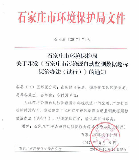 近日河北石家莊市環(huán)保局印發(fā)《石家莊市污染源自動監(jiān)測數(shù)據(jù)超標(biāo)懲治辦法(試行)》(以下簡稱“辦法”)。辦法明確,企業(yè)污染源自動監(jiān)測數(shù)據(jù)出現(xiàn)超標(biāo)將被處罰,超標(biāo)4次及以上,將停產(chǎn)整治。辦法自11月1日起施行。