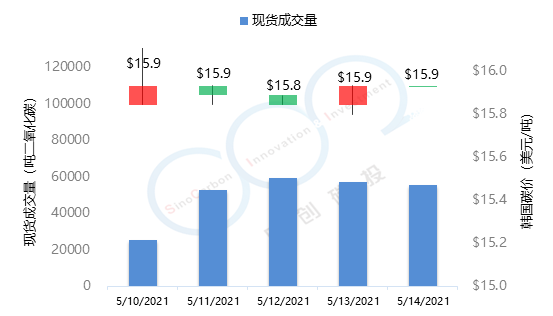 2021年5月10日至5月14日,本周韓國碳價在15.9美元/噸上下波動。本周韓國碳市場成交量近25萬噸,高于上周22萬噸的水平。