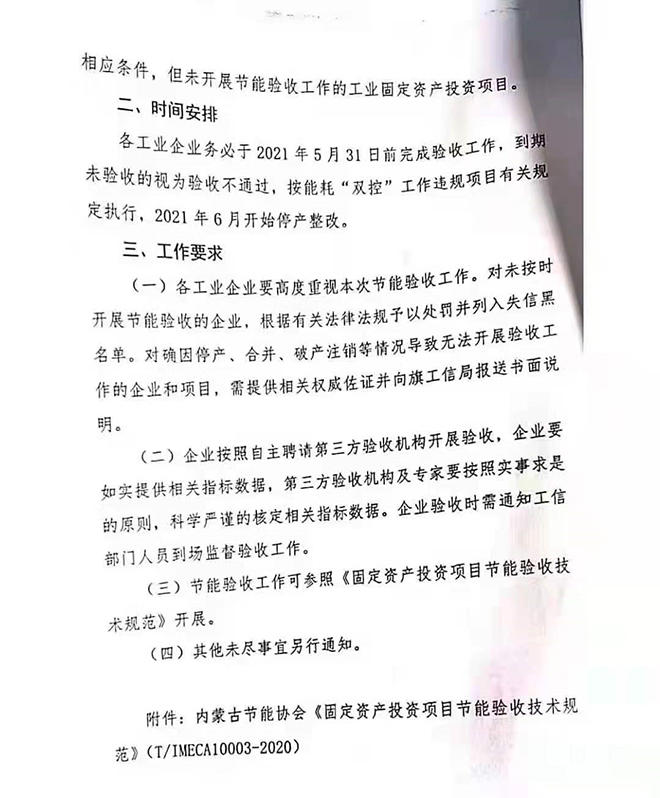 烏拉特前旗:對(duì)全旗工業(yè)企業(yè)開(kāi)展節(jié)能審查驗(yàn)收,對(duì)期限內(nèi)驗(yàn)收不通過(guò)的企業(yè),按能耗“雙控”工作違規(guī)項(xiàng)目有關(guān)規(guī)定執(zhí)行停產(chǎn)整改。