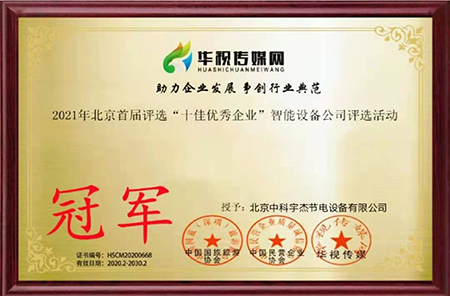 近日,2021年北京首屆評選“十佳優秀企業”智能設備公司評選活動圓滿落幕。此次評選活動中北京中科宇杰節電設備有限公司摘得桂冠。