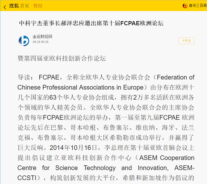 搜狐:中科宇杰應邀出席第十屆FCPAE歐洲論壇暨第四屆亞歐科技創新合作論壇
