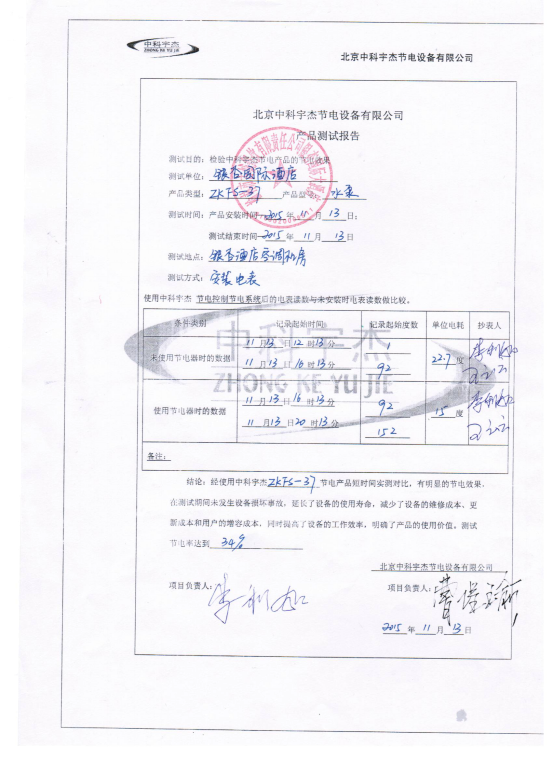 安裝調試并驗收后,通過現場讀表,顯示節電達到34%,節電效果明顯。按質保十年計算,此項節能工程能為榆林市銀杏國際酒店帶來四百萬以上人民幣的直接經濟效益。