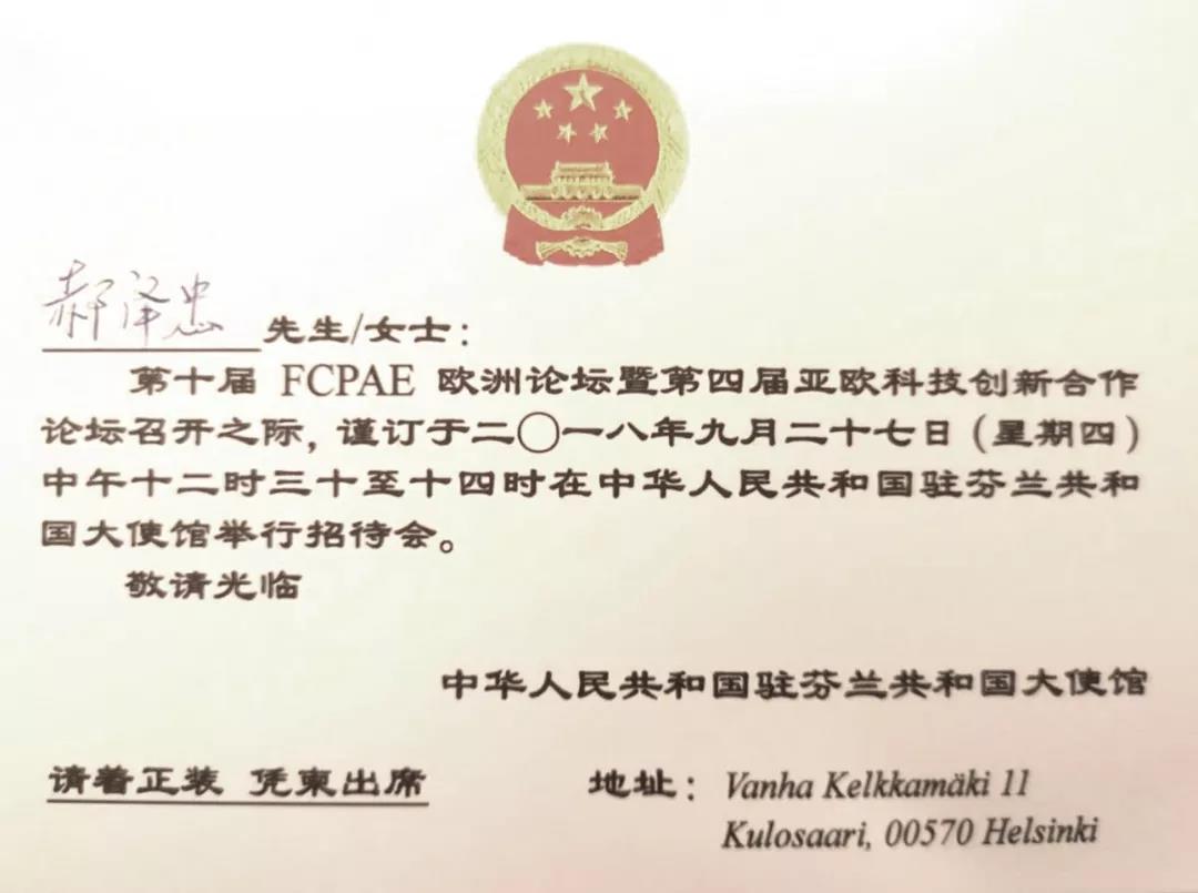 全球公益系列活動在芬蘭傳遞期間正值第十屆FCPAE歐洲論壇暨第四屆亞歐科技創新合作論壇在芬蘭赫爾辛基召開,倡導環保節能低碳的公益活動得到了論壇舉辦方以及中國駐芬蘭大使館的廣泛關注和大力支持,以中科宇杰董事長郝澤忠為代表的宣傳團一行受邀出席中國駐芬蘭大使館招待會。