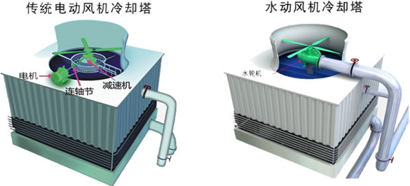 水輪機取代傳統冷卻塔中的電機、連軸節、減速機、達到節電效果